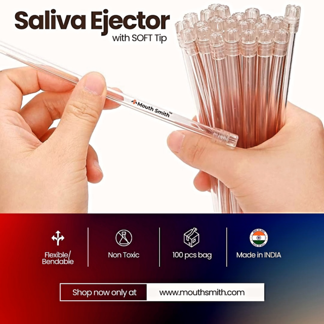 MOUTH SMITH™ Saliva Ejector with a Soft Tip, is a dental suction tip used to remove saliva, blood, and other fluids from the patient’s mouth during dental procedures.